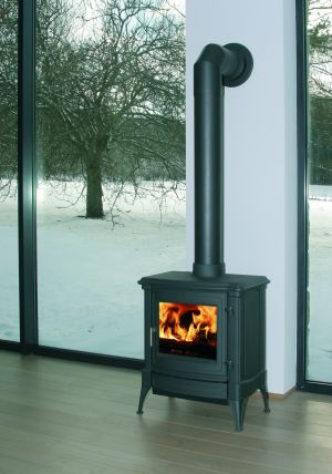 Stufa in ghisa a fuoco continuo, con vetro autopulente e doppia combustione dei gas incombusti.