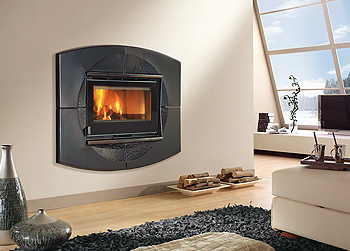 La forma si riscopre nella sua variante di finitura in preziosa maiolica nuvolata e liscia nel nuovo colore argento antico. Allestimento per inserto 80 Crystal Ventilato Focolare in ironker Porta panoramica con apertura a dx-sx.