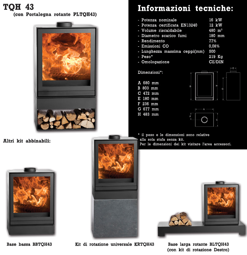 Stufa contemporanea in acciaio con tecnologia Woodbox a quadrupla parete da 16 Kw., rivestita internamente in ghisa smaltata bianca e porta con vetro ad emissione termica controllata “IR”. Disponibile in quattro modelli, abbinabili a 4 diversi kit di rotazione: base larga o bassa rotante in acciao di grosso spessore,piedistallo portalegna rotante o il solo kit di rotazione universale, abbinabile a qualsiasi tipologia di soluzione.