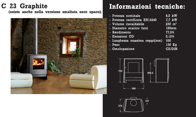 La stufa C 23 con le sue linee curve e delicate, sembra avvolgervi in un tenero e caldo abbraccio, offrendo una semplicità ed un'eleganza che consente di armonizzarsi facilemente con le ultime tendenze del design d'interni.