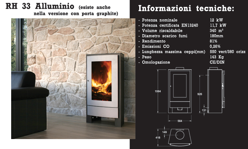 La fiamma diventa protagonista assoluta all'interno del modello RH 33. L'ampio focolare è in grado di riscaldare spazi di grandi dimensioni offrendo al contempo una vista spettacolare del fuoco, grazie all'equilibrato e snello sviluppo verticale delle fiamme. Impossibile non rimanere incantati nel fissare i loro movimenti, che catturano il vostro sguardo come dame danzanti.