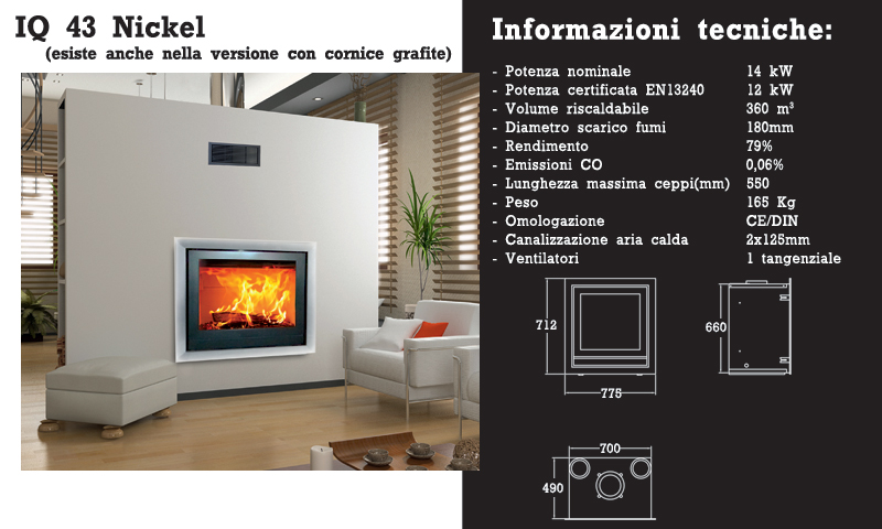 Inserto canalizzabile in acciaio a fuoco continuo, con vetro unico autopulente e ad emissione termica controllata. Fornito di serie di un ventilatore tangenziale, con spegnimento automatico all'apertura della porta.