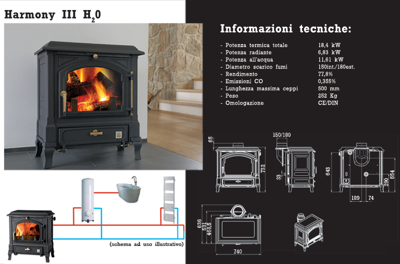 La stufa in ghisa classica Harmony in versione ad acqua mantiene le stesse caratteristiche della versione con combustione Multifuel, ma con la possibilità dell'allacciamento all'impianto di circolazione dell'acqua. E' dotata di regolazione termostatica modulante della combustione, in funzione della richiesta dell'impianto.